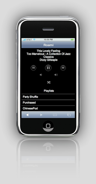 Use Roami to view and select playlists, play/pause music, shuffle selections, and adjust the volume of iTunes running on your Mac. You'll no longer need to run back to you Mac to adjust the music.. just press a button on your iPhone or iPod Touch. No software is loaded on your iPhone; it's all done through Safari.